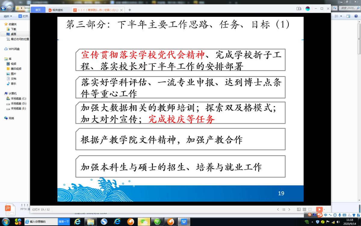 下半年工作重点主要在于:一是宣传贯彻落实学校党代会精神、实现防疫工作常态化管理;二是落实好学科评估、一流专业申报、达到博士点条件等重心工作;三是加强大数据相关的教师培训,探索双及格模式;四是根据产教学院文件精神,加强产教合作;五是加强学科建设与本科生与硕士的招生、培养与就业工作;六要加大对外宣传,完成40周年校庆等各项工作。