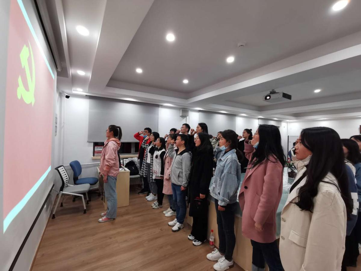 最后,举行新党员宣誓仪式,仪式在庄严的《国际歌》声中进行,全体党员在李影同志的带领下,举起右手,面向党旗庄严宣誓,响亮的宣誓声萦绕在教室,表达了全体党员坚定的入党信念和为共产主义事业奋斗终身的决心。