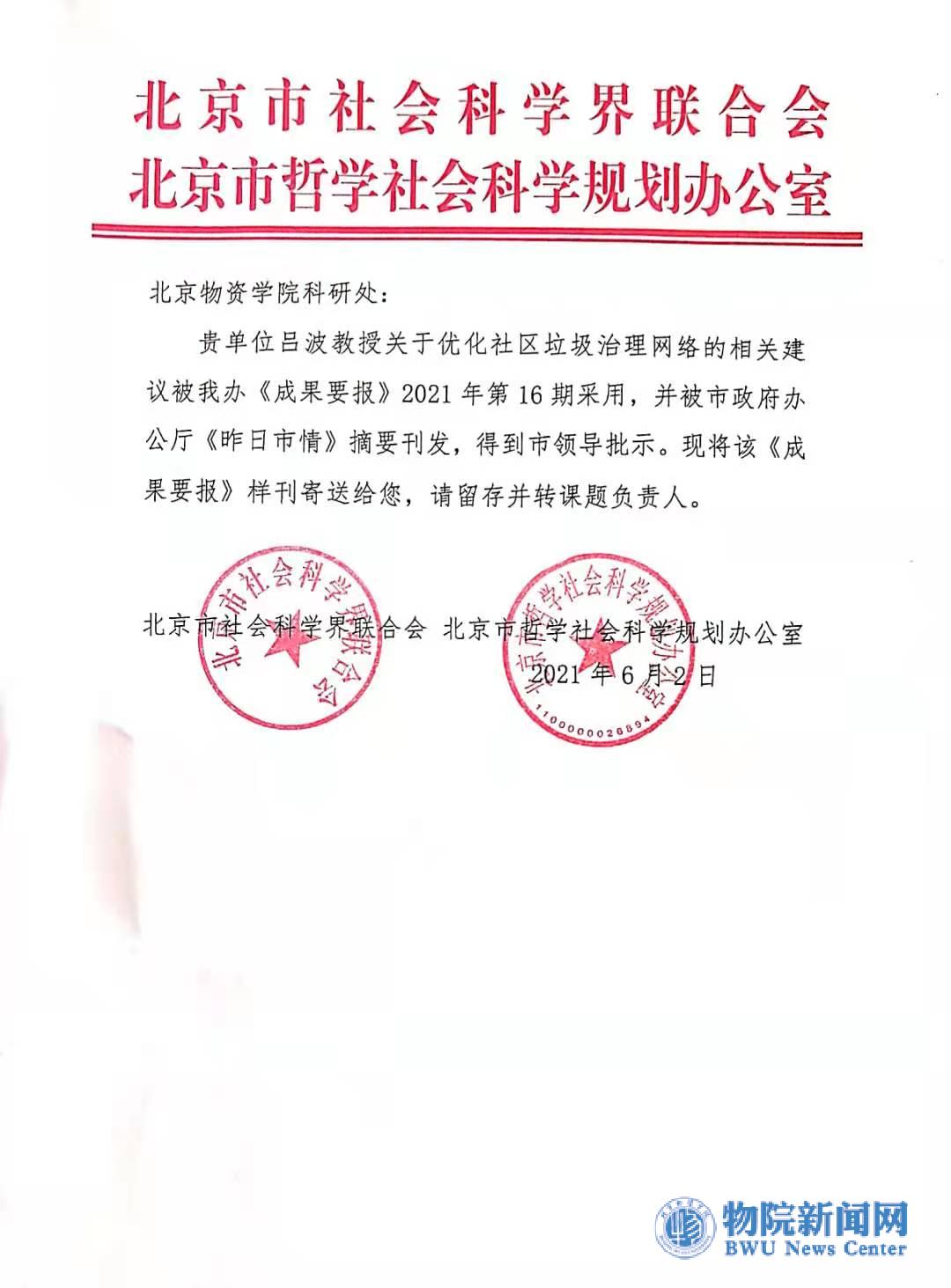 吕波教授及团队成员基于管理网络项目研究成果,即关于优化社区垃圾治理网络的相关建议被北京市社科基金《成果要报》2021年第16期采用,并被市政府办公厅《昨日市情》摘要刊发并获得北京市领导的肯定性批示。吕波教授聚焦管理网络研究前沿,坚持问题导向,就推进北京市的热点难点问题提出了科学观点和对策建议,为服务首都发展做出了贡献。据悉,吕波教授基于管理网络的另一研究成果《精准建设“四网”,加强应急物资保障》在2020年被北京市党政主要领导肯定性批示。
