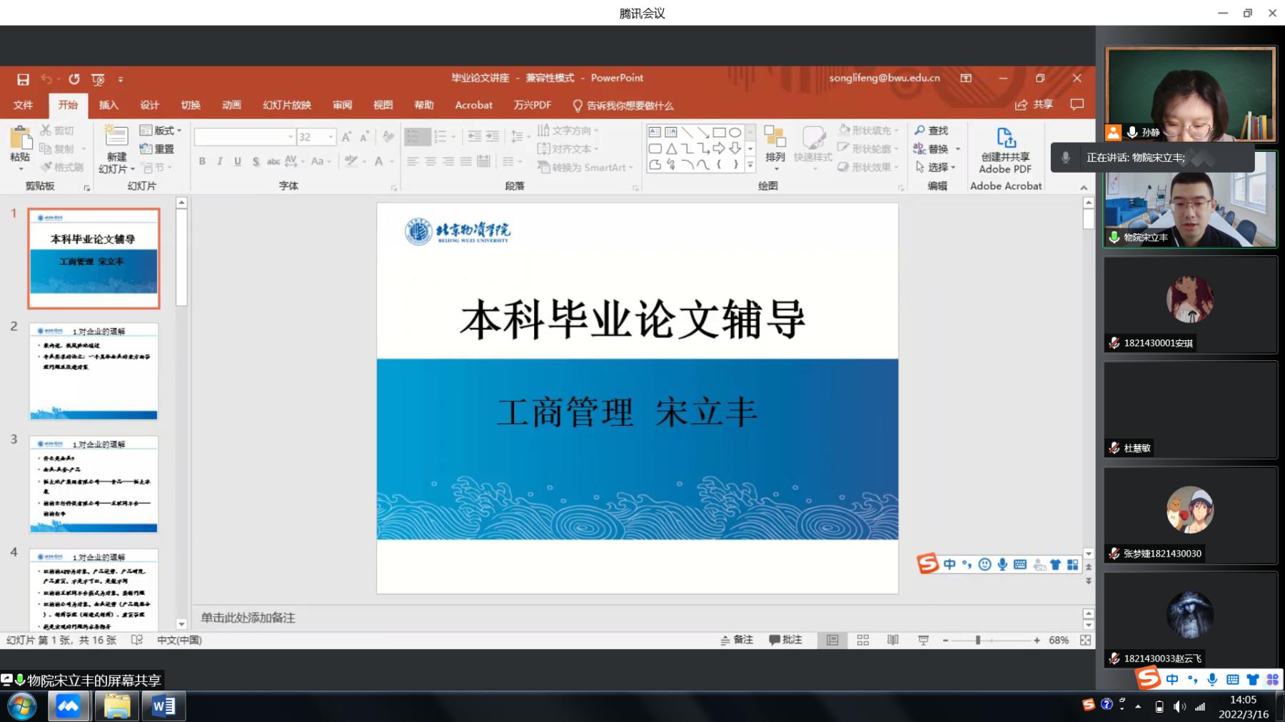 为提高工商管理本科毕业论文质量,解决学生在写作过程中遇到的一般性问题,3月16日下午工商管理系面向22届全体毕业生举行了毕业论文写作线上培训会。此次会议由工商系主任孙静副教授主持,宋立丰副教授主讲,全体2022届毕业生参加。