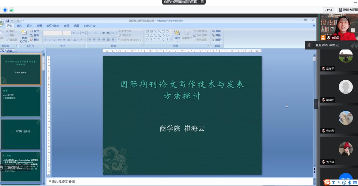 市场营销系举行了月度例行教研活动,市场营销系副教授、硕士生导师崔海云老师结合自己丰富的国际期刊学术论文发表经验,做了题为“国际期刊论文写作技术与发表方法探讨”的讲座。为创造良好的学术氛围,提高同学们的学术热情,本次教研活动除了市场营销系教师参加之外,还邀请了对本话题感兴趣的部分研究生和其他专业的教师参加。