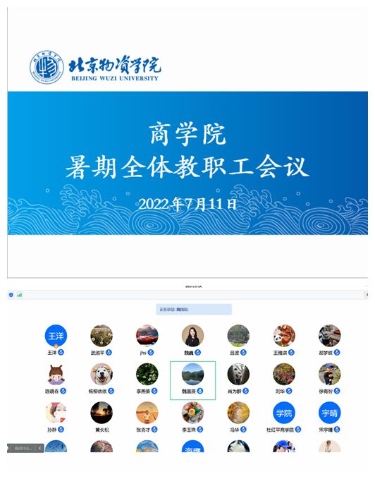 学院党委书记魏国辰传达了学校暑期疫情防控与安稳工作精神,要求全体教职工严格遵守规定、增强安全意识、遵守属地和北京市疫情防控政策、注意旅途安全、严格遵守进出京审批、开学前一周集体返京、遇到突发情况及时报告、做好开学准备和学生返校疫情防控准备。魏书记还对《党建基本标准》集中检查工作推进和MBA教育教学工作进行介绍和布置。