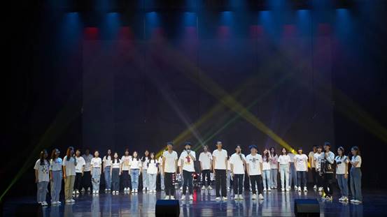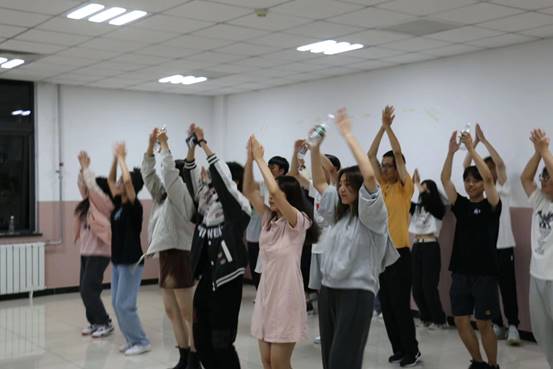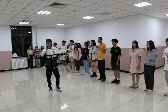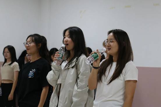 学生会文艺部的全体工作人员工作人员以及来自商院22级各个班级的参演同学便卯足了劲儿排练。白天,老师伏案工作,同学们在军训场挥洒汗水,晚上大家便聚集在二教进行排练。串烧歌曲,这之中有太多不易。流行与流行的勾合,曲调与节奏的碰撞,四位主唱,若干助演,一环扣一环,一个搭一个,每一个鼓点,每一个节拍都需要一丝不苟地完成。试唱、排练、纠错、改正,一次次反复磨合,一遍遍重头再来。大家从未叫过苦,从没喊过累,而是彼此配合一同坚持。