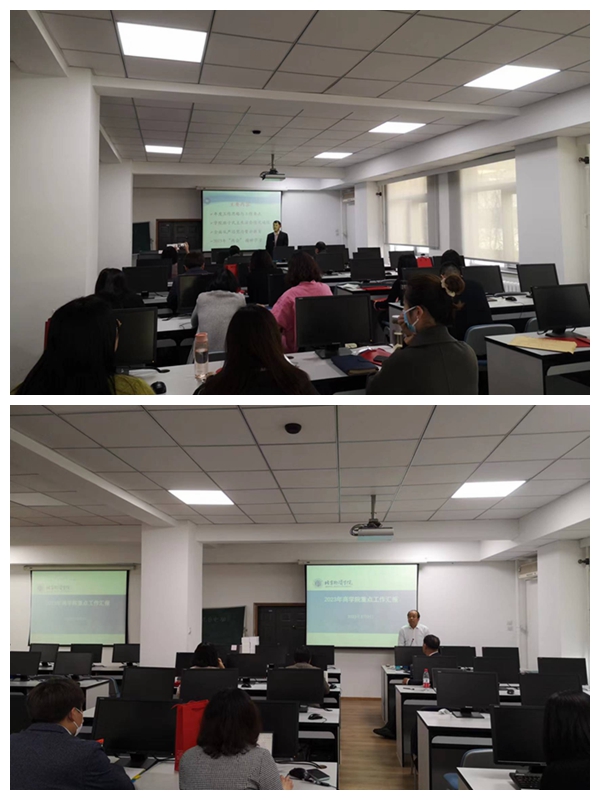 学院院长助理李玉珠对科研和研究生培养工作进行介绍:一是对博士点申报情况、对标北京市一流学科建设情况进行介绍,提出学院要落实学校学科建设相关制度、推动学科建设上水平;二是研究生培养工作,完成研究生招生工作、推进培养方案及教学大纲、专业学位点实践基地建设和学位工作;三是科研工作,对教师申报情况进行总结分析,要加强科研平台建设、科研团队建设、科研成果支持力度、支持教师科研相关培训、鼓励青年教师挂职等。