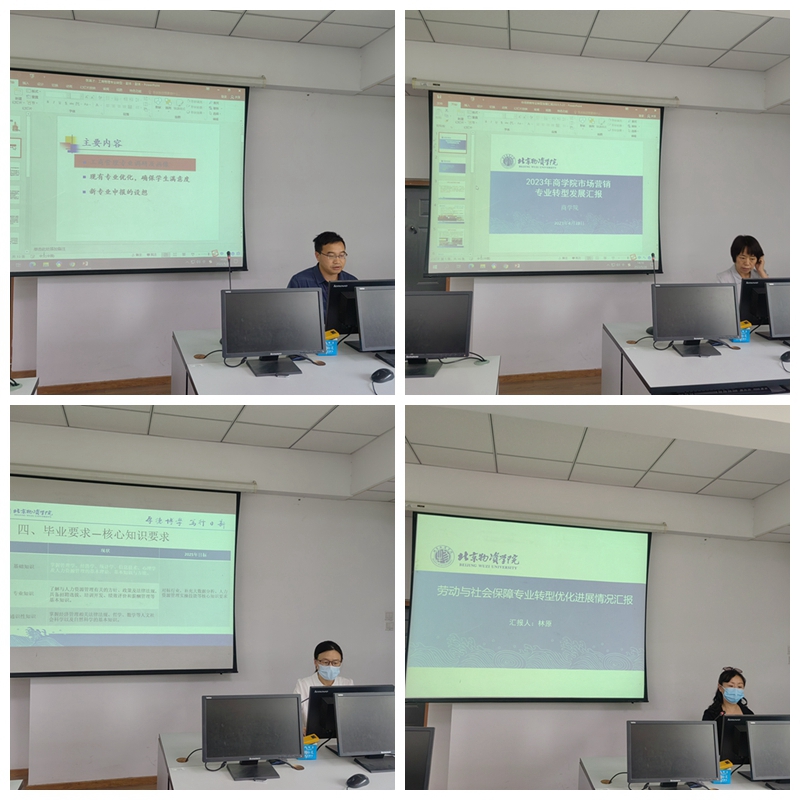 会上,学院各专业主任、系主任和专业负责人汇报了目前各专业转型优化的思路和提升培养质量的建议。工商管理专业在调研基础上进一步明确了专业画像,突出增加企业实践内容、增加课程与职业证书结合、强化师生互动。同时对新专业申报提出设想:要符合国家和北京市发展需要、符合学校发展特色、符合物流流通和大宗商品流通。市场营销专业共展开了18项要素调查。结合对北京市17家大宗商品头部企业的调研,对专业画像进一步明确,即专业底色是大宗商品现货的商贸流通,与电商专业在课程、实训场景、证书融合。人力资源管理提出了服务京津冀协同发展和国家人才强国战略、服务人力资源服务业和流通产业、聚焦服务北京和副中心建设,辐射京津冀区域、契合学校优势特色(物流和流通)的专业定位,提出数智化转型与建设精英班/实验班的任务和目标。劳动与社会保障专业提出与人力资源管理专业融合发展的思路,通过走访调研,探索“微专业+X证书”培养模式,探索与北京市人力资源服务业龙头企业校企联合培养人才,开设劳动与社会保障(人力资源服务业)实验班,完成课程数智化转型,提高人才培养质量。