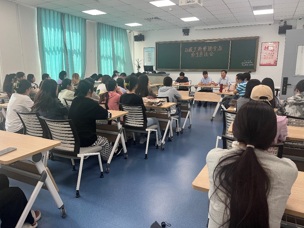 党委书记魏国辰教授、工商管理专业全体教师、21级工商管理1班、工商管理精英班的全体学生参加了本次座谈,座谈会由系主任孙静主持。