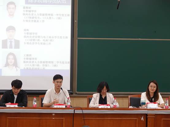 党委副书记陈霄英介绍了学院学生工作架构及特色,鼓励新生积极参与校园丰富多彩的文化生活,不迷失自我、不虚度光阴,在提高专业知识的同时,享受大学生活,不断完善自我。辅导员董海辰讲解了《学生手册》里的相关学生处分条例,并为同学们介绍大学征兵计划和渠道,号召新生们严格遵守学校规章制度,积极应征入伍、报效祖国。辅导员王雅琪介绍了大学入团、入党流程,希望新生们要端正入团、入党动机,不断通过学习提高对党的正确认识,积极向组织靠拢。辅导员陈昕讲解了资助工作、评奖评优流程及要求,使同学们对学院奖助学金评审工作有了初步的认识与了解。