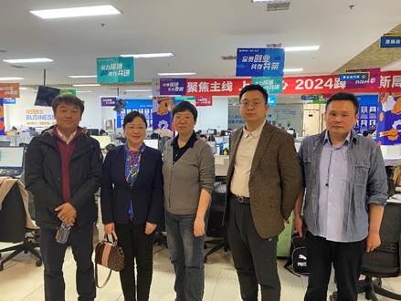 2024年4月12日,张艳教授和孟浩老师应邀前往北京苏宁部总部,与北京苏宁人力资源部总监郝蓉、消费电子商品运营部采销总监王朝瞳、人力资源部经理魏志军就直播实践基地、1+X证书、技能培训体系、产教融合型企业等具体事项进行交流讨论,初步明确《直播营销及AI技术实践》课程的开课进度和基本模式。