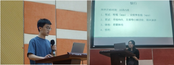 在求职分享环节,20级的郭柏格、刘根硕两位同学从求职就业角度分享了自己在大学四年的奋斗历程。表示要在根据自身兴趣爱好、技能分析、个性特质和价值观等方面锁定求职目标后,尽可能的丰富实习经历,做好信息搜集,以积极心态应对挑战准备笔试面试,持续学习并实现自我提升。