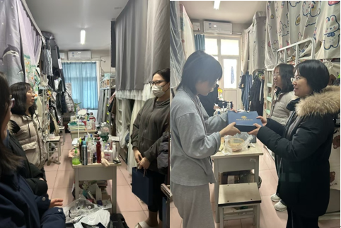 党委副书记陈霄英,班主任欧海鹰、罗倩文、李代珩,辅导员王雅琪等走访学生宿舍,慰问考研冲刺阶段的毕业年级学生,为他们加油鼓劲,送上贴心的考试学习用品,以实际行动表达学院对考研学子们的深切关怀。
