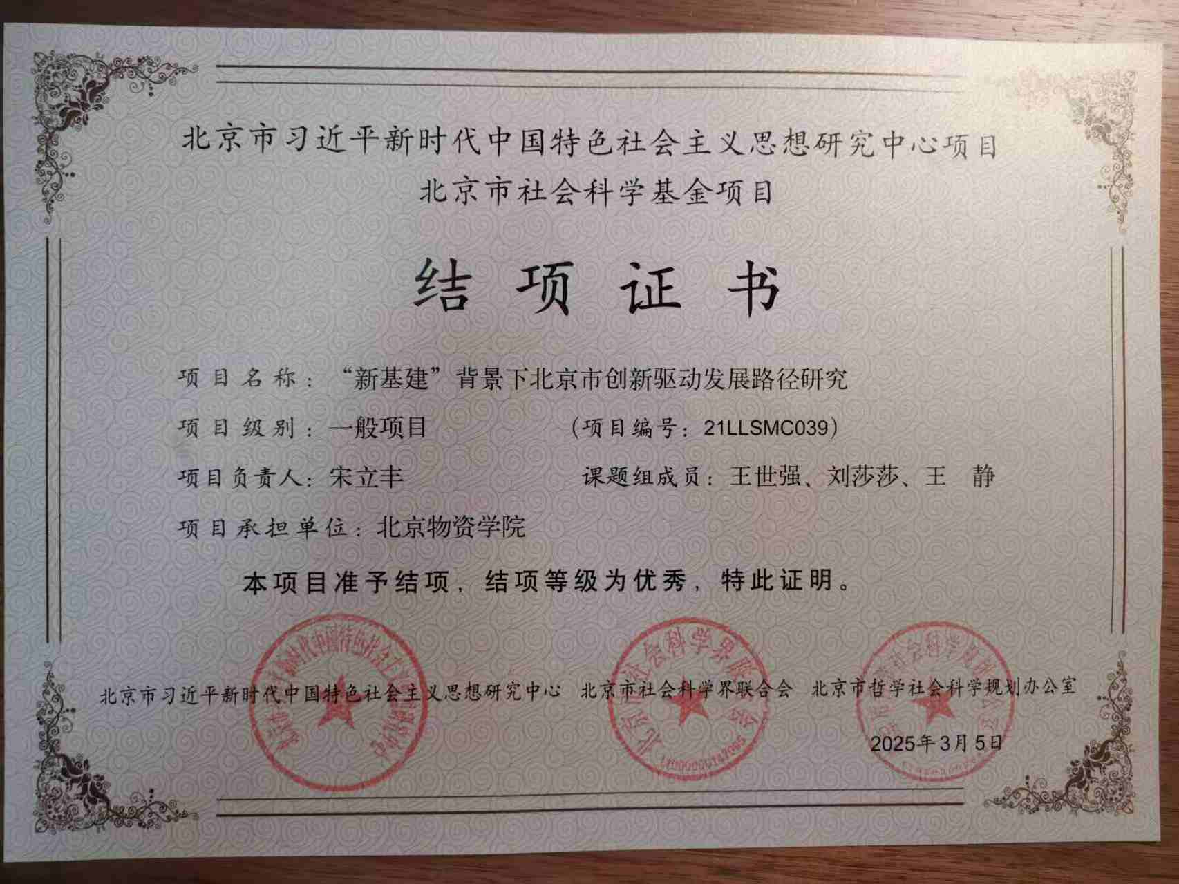 宋立丰副教授主持的北京市社会科学基金项目《“新基建”背景下北京市创新驱动发展路径研究》顺利结项并获评优秀等级。