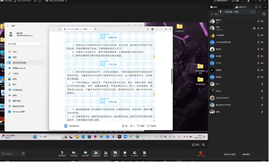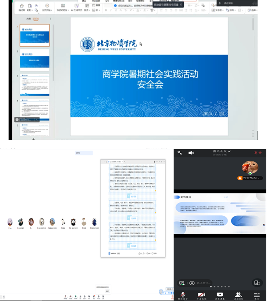 学生会对外联合实践部通过腾讯会议召开全院暑期社会实践团队安全专题培训会,同时各班召开班会,两个会议重点强调团队管理、安全责任、意识形态、人身安全、财产安全、交通安全、防暑降温及应急联络等重点工作,确保各实践团队统一思想,提高安全意识,聚焦团队协作中的相互关照义务,鼓励高年级党员、研究生在带领低年级及本科生实践过程中切实发挥安全监督与帮扶作用,将“党员带团员”、“高年级带低年级”的组织优势转化为坚实的安全保障。