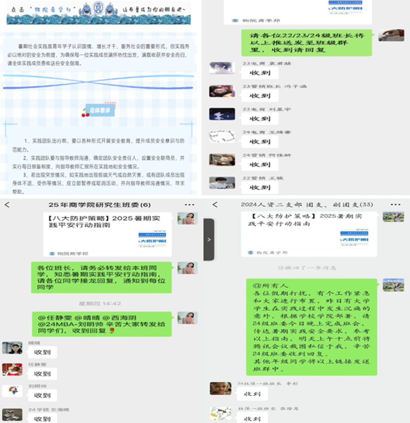 第一时间通过官方公众号、班级群等多渠道发布《【八大防护策略】2025暑期实践平安行动指南》,系统梳理了涵盖人身安全、财产安全、交通安全、户外安全及突发事件处理等关键环节的注意事项,要求全体师生务必强化风险意识,将安全红线意识内化于心,外化于行,严格遵守安全纪律,确保“安全第一”理念贯穿实践全过程。