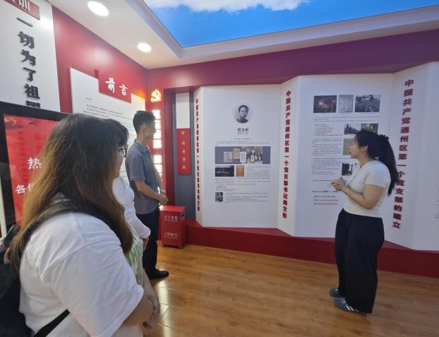 实践团队在潞河中学党政办副主任梁莹莹老师和邓岳婷老师的带领下,先后参观校园标志建筑群、校史馆、党史馆,对潞河中学158年建校历史进行了全面直观的了解。在学校党史展室重点学习了周文彬同志任党支部书记于1927年在潞河中学建立通州区第一个党支部的辉煌事迹,以及潞河师生践行百年红色征程的初心使命。