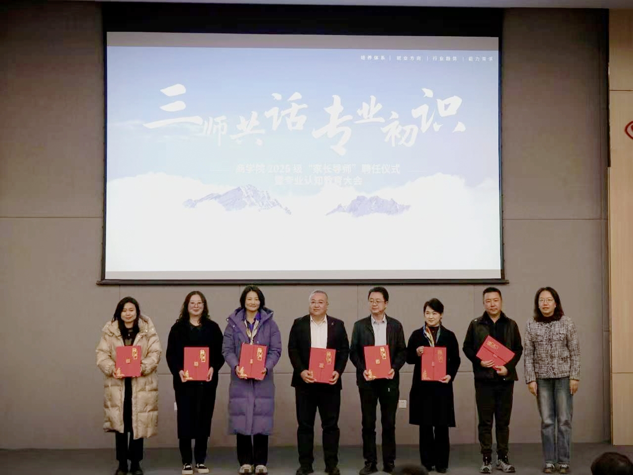 在知新楼举行了2025级“家长导师”聘任仪式暨“三师共话·专业初识”专业认知教育系列活动。党委学生工作部部长常娥,学院领导班子、各系主任、2025级班主任及全体家长导师出席活动。