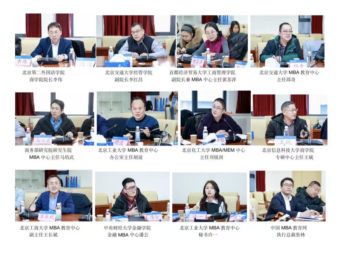 本次研讨会特邀全国MBA教育指导委员会秘书处办公室主任、中国学位与研究生教育学会工商管理专业学位工作委员会秘书长王萍,北京第二外国语学院、北京交通大学、商务部研究院研究生院、首都经济贸易大学、北京工业大学、北京化工大学、北京信息科技大学、北京工商大学、中央财经大学、北方工业大学等院校代表,以及行业代表中国MBA教育网执行总裁张林,各方共同围绕MBA培养质量提升与招生方案创新两大核心议题展开深入交流与经验互鉴。会议由MBA教育中心主任张喜才主持。