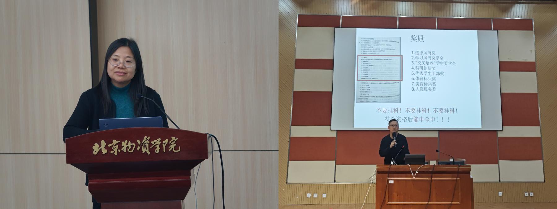 副院长武淑平聚焦不同年级学业规划核心要点,系统梳理毕业论文撰写、学分修取及选课管理要求,从大学全周期角度分享了如何通过合理规划课程实现能力提升,对个人培养方案进行解读,引导学生树立清晰的学业目标,端正学习态度,积极应对学业挑战。辅导员胡光宇聚焦奖励资助、规范流程、校园实用三大核心板块,帮助同学们梳理了奖学金、助学金、临时困难补助等各类奖励资助项目的申报条件、时间节点和评审流程。明确了学校学生纪律、考勤管理制度。解答了同学们日常学习生活中的学业咨询、生活保障、应急求助等实际问题。