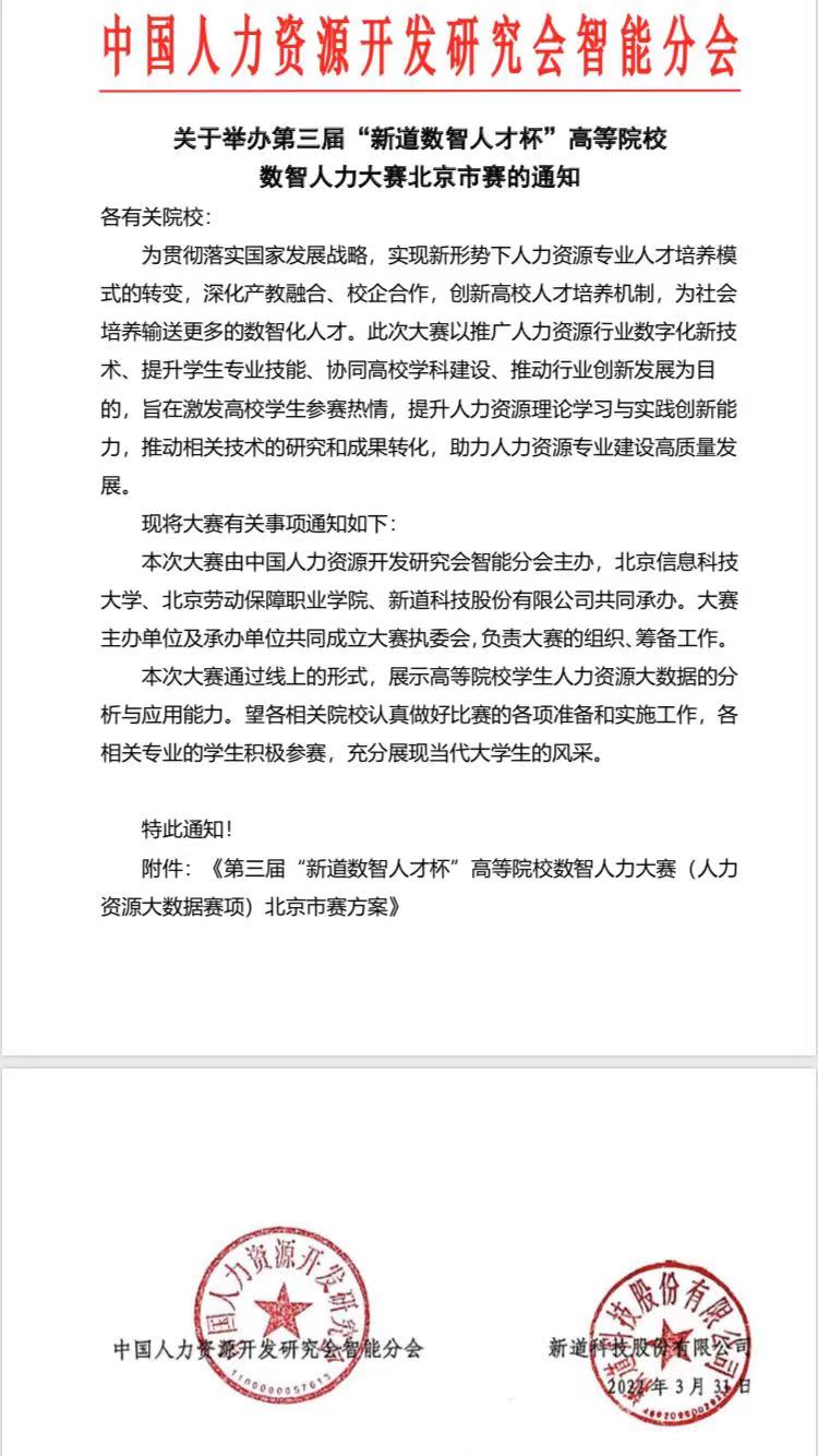 此次大赛以推广人力资源行业数字化新技术、提升学生专业技能、协同高校学科建设、推动行业创新发展为目的,旨在激发高校学生参赛热情,助力人力资源专业建设高质量发展。大赛由中国人力资源开发研究会智能分会主办, 北京信息科技大学、北京劳动保障职业学院、新道科技股份有限公司共同承办。将通过线上的形式,展示高等院校学生人力资源大数据的分析与应用能力。