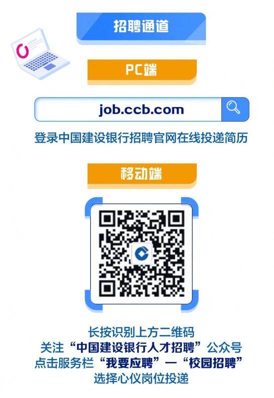 2.移动端报名。关注“中国建设银行人才招聘”公众号,通过公众号底部“我要应聘”入口进行报名。