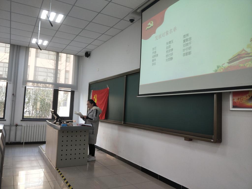 首先由支部书记闫慧凝宣布到场人数,明确可以召开会议。随后由15名入党积极分子宣读入党志愿书,汇报对党的认识、入党动机和个人情况。每一名入党积极分子宣读结束,都有其入党介绍人、与会其他党员对积极分子是否符合发展条件发表意见。随后,与会党员充分讨论并发表意见。大会采取无记名投票方式,由正式党员的投票,副书记绉嘉辉监票,党支部委员姚雪记票。最后宣读并通过支部大会决议,根据投票结果15名积极分子一致通过,发展成为中共预备党员。