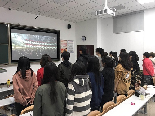 当国歌的旋律响起的那一刻,大家都自发地站立起来,跟唱着国歌。在座的同学们认真观看了习近平总书记重要讲话,深入贯彻了此次大会的主题:不忘初心,牢记使命,高举中国特色社会主义伟大旗帜,决胜全面建成小康社会,夺取新时代中国特色社会主义的伟大胜利,为实现中华民族伟大复兴的中国梦而不懈奋斗。习近平总书记重要讲话赢得台下一阵阵喝彩,同学们也针对重要变革开始认真的做着记录。