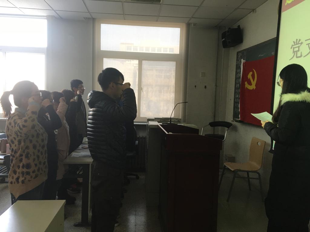 首先由主持人隗薇宣布到场人数,随后,全体起立,面向党旗,奏唱国际歌。紧接着,由9名入党积极分子宣读入党志愿书,汇报对党的认识、入党动机和个人情况。每一名入党积极分子宣读结束,都有其入党介绍人、与会其他党员对积极分子是否符合发展条件发表意见。最后,进过正式党员的投票、唱票,九名积极分子一致通过,发展为预备党员。