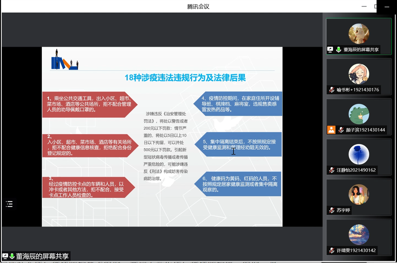 最后董海辰老师先就理论学习具体内容,强调各党员应该关注了解大事、喜事、盛事、要事,向青年提出新要求新希望。随后就目前疫情形势与各位党员进行沟通,普及18种涉疫违法违规行为及法律后果、“抓典型”分享属地社会违反疫情防控热点案例、高校大学生违反疫情防控警示案例,强调在疫情特殊时期应该保持积极的心态、以及作为学生党员应该严格遵守防疫要求。