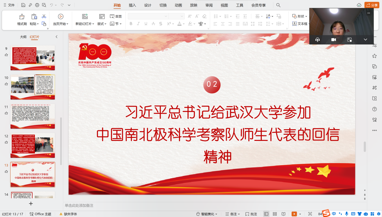 李心怡同志针对习近平总书记给武汉大学参加中国南北极科学考察队师生代表的回信精神发表了自己的学习感悟:习近平总书记的回信不仅让我们看到国家对极地研究的重视,更让我感到使命光荣、责任重大。在以后的学习和生活中以习近平总书记的殷切希望为努力的方向,牢记使命,砥砺前行。也要以习近平总书记回信为契机,发挥学科优势,继续砥砺奋斗,“用国家的大事业磨砺青年人的真本领”,加强国际交流与合作。