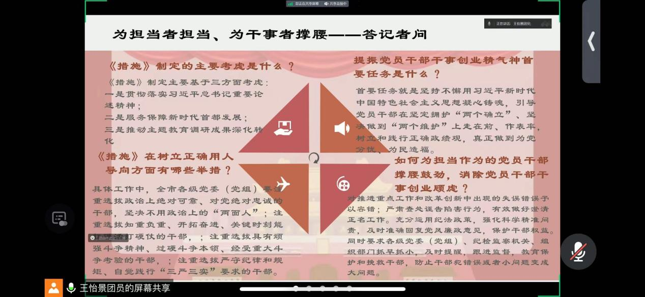 会议最后一部分是“为担当者担当、为干事者撑腰——市纪委市监委、市委组织部有关负责人就《关于深入推进全面从严治党提升党员干部干事创业精气神的若干措施》答记者问”部分。具体回答了全市党员干部干事创业精气神怎么样?《措施》制定的主要考虑是什么?提振党员干部干事创业精气神首要任务是什么?《措施》在树立正确用人导向方面有哪些举措?《措施》如何为担当作为的党员干部撑腰鼓劲,消除党员干部干事创业顾虑?《措施》在提升干部素质能力方面有什么具体举措?《措施》如何让基层党员干部从“文山会海”“填报材料”中解脱出来,有更多时间和精力抓落实?《措施》在关心关爱干部方面有哪些新的举措?《措施》在关心关爱干部方面有哪些新的举措?等若干个问题,激励首都党员干部放开手脚大胆创新、甩开膀子开创事业。