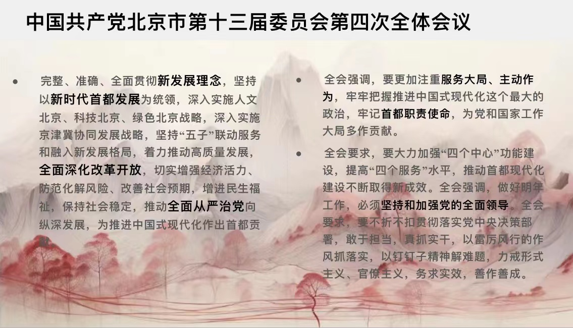 接着,王怡景同志带领大家再次学习中国共产党北京市第十三届委员会第四次全体会议决议。全会强调,要更加注重服务大局、主动作为,牢牢把握推进中国式现代化这个最大的政治,牢记首都职责使命,为党和国家工作大局多作贡献。全会要求,要大力加强“四个中心”功能建设,提高“四个服务”水平,推动首都现代化建设不断取得新成效。