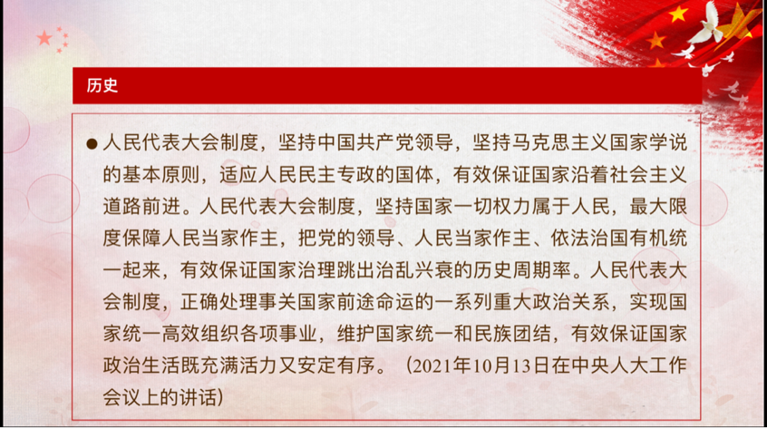 活动的最后学习了坚持和完善人民代表大会制度保障人民当家作主,人民代表大会制度,坚持中国共产党领导,坚持马克思主义国家学说的基本原则,适应人民民主专政的国体,有效保证国家沿着社会主义道路前进。人民代表大会制度,坚持国家一切权力属于人民,最大限度保障人民当家作主,把党的领导、人民当家作主、依法治国有机统一起来,有效保证国家治理跳出治乱兴衰的历史周期率。选举人大代表,是人民代表大会制度的基础,是人民当家作主的重要体现,“第二个结合”让我们掌握了思想和文化主动,并有力地作用于道路、理论和制度。从我国历史发展上来看坚持和完善人民代表大会制度,是我国的正确道路,也是未来我国要不断完善和坚定走下去的道路。