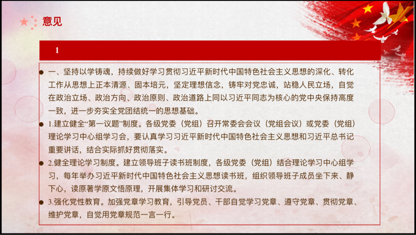 主要提出四点意见。一、坚持以学铸魂,持续做好学习贯彻习近平新时代中国特色社会主义思想的深化、转化。工作从思想上正本清源、固本培元,坚定理想信念,铸牢对党忠诚站稳人民立场。二、坚持以学增智,不断从党的创新理论中悟规律、明方向、学方法、增智慧学深悟透习近平新时代中国特色社会主义思想,把握好这一思想的世界观和方法论,运用好贯穿其中的立场观点方法特别是“六个必须坚持”,把看家本领、兴党本领、强国本领学到手,着力提升政治能力、思维能力、实践能力,担负好党和人民赋予的政治责任。三、坚持以学政风推动全党以自我革命精神,解决党风方面的突出问题。深入学习贯彻习近平,总书记关于党的自我革命的重要思想,对标党风要求找差距、对标党性要求查根源、对照党纪要求明举措。四、坚持以学促观不折不扣贯彻落实党中央决策部署,坚持学思用贯通、知信行统一,匡正干的导向,增强干的动力,形成干的合力迎难而上,勇于斗争,鼓足干事创业的精气神,形成狠抓落实的好局面,汇聚起以中国式现代化,全面推进强国建设民族复兴伟业的强大力量。