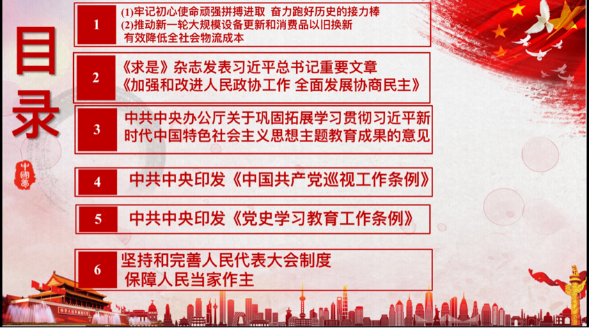 市场营销与电子商务专业学生党支部成员召开3月(扩大)理论学习会,深入学习牢记初心使命顽强拼搏进取,奋力跑好历史的接力棒、推动新一轮大规模设备更新和消费品以旧换新有效降低全社会物流成本、《求是》杂志发表习近平总书记重要文章《加强和改进人民政协工作 全面发展协商民主》、中共中央办公厅关于巩固拓展学习贯彻习近平新时代中国特色社会主义思想主题教育成果的意见、中共中央印发《中国共产党巡视工作条例》、中共中央印发《党史学习教育工作条例》、坚持和完善人民代表大会制度保障人民当家作主。