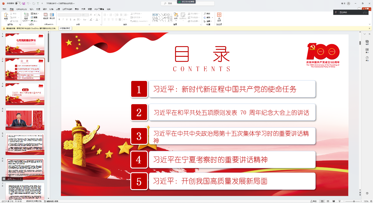 市场营销与电子商务专业学生党支部第一党小组召开7月政治理论学习会,深入学习习近平:新时代新征程中国共产党的使命任务;习近平在和平共处五项原则发表70周年纪念大会上的讲话;习近平在中共中央政治局第十五次集体学习时的重要讲话精神;习近平在宁夏考察时的重要讲话精神;习近平:开创我国高质量发展新局面