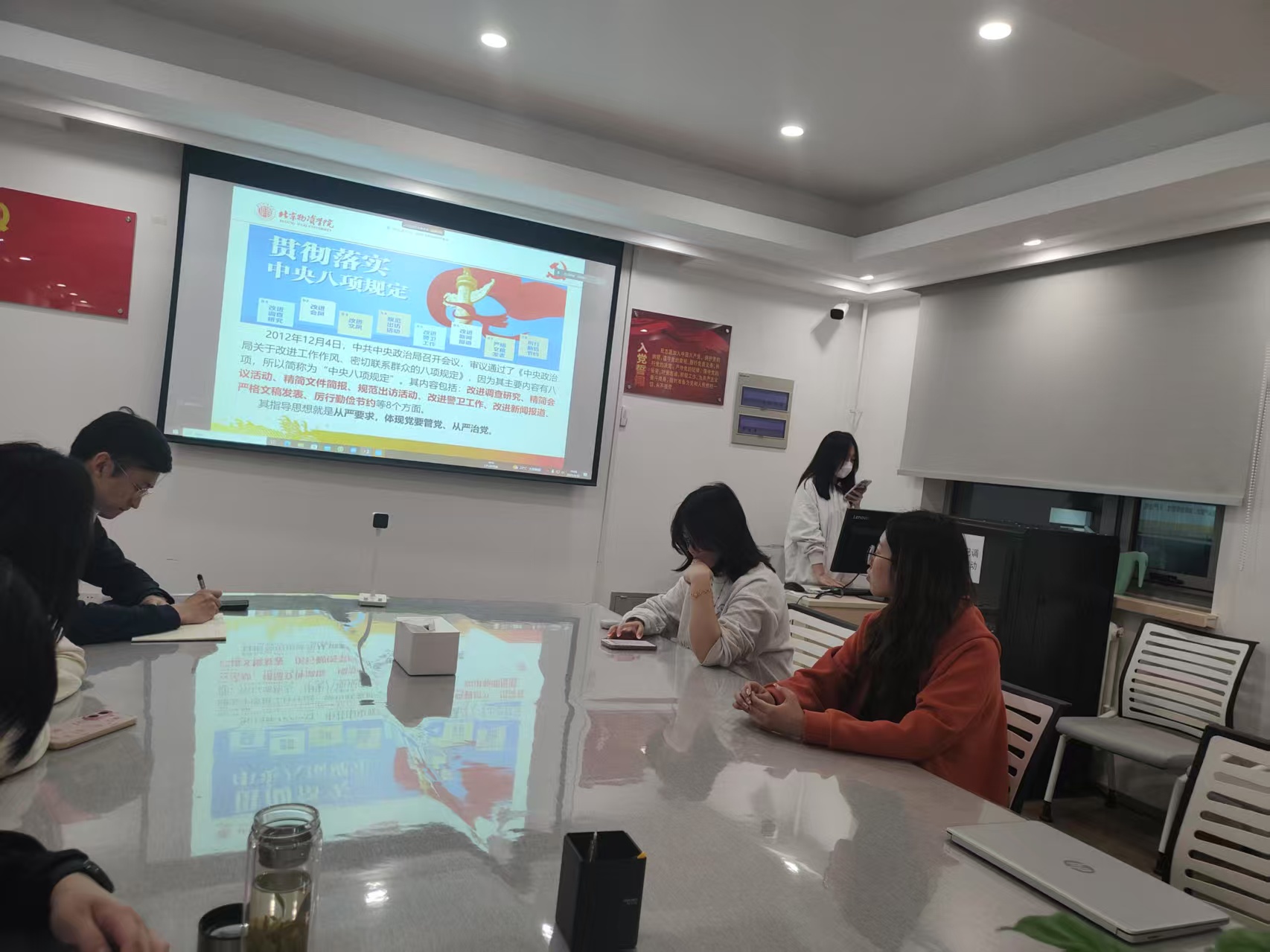 2025年04月10日19:00,党支部组织全体党员在科研楼410召开理论学习会。此次会议由人力资源管理专业学生第一党支部书记董海辰同志主持。本次理论学习会主要围绕学习并贯彻落实中央八项规定精神与习近平关于加强党的作风建设论述摘编相关内容展开。