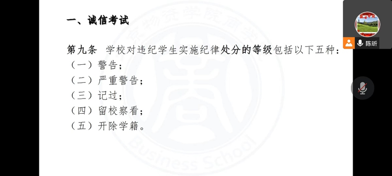 陈昕以学生手册为依据,截取学生手册中关于诚信考试部分进行详细讲解,为全体家庭经济困难学生解读不同违反诚信行为对应的处分等级,同时给学生介绍了目前常见的违纪行为,要求所有学生要杜绝违纪行为,并且要规避会被误认为作弊的行为,要做到不被任何人质疑,始终牢记诚信考试这一基本要求,同时祝愿所有家庭经济困难学生取得优异成绩。