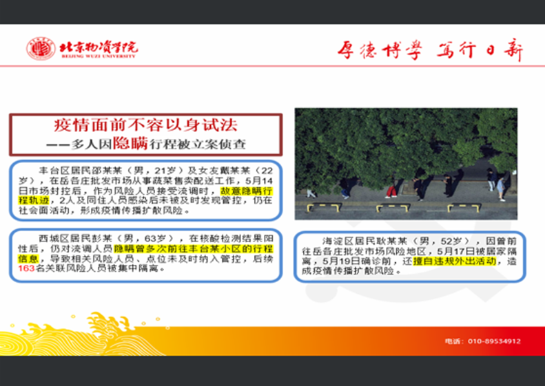 陈昕紧密结合疫情防控实际和封闭管理青年学生思想特点,带领大家集中学习国家、北京市和学校的最新疫情防控政策,同时,结合高校疫情防控典型案例进行警示教育,强调了关于学生“翻墙外出”“未按规定时间参加核酸检测”的相关规定,引导同学们加强思想认识,理解、支持、配合疫情防控政策,严格遵守学校疫情防控的相关规定,筑牢校园疫情防线。