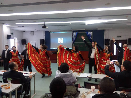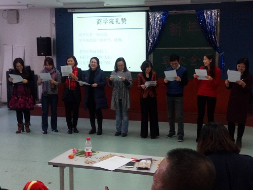 联欢会在人力资源系老师们的交谊舞节目中开始,伴随着美妙的乐曲《春天的芭蕾》,老师们穿着节日的盛装翩翩起舞,给联欢会带来了欢乐的气氛。在院长魏国辰教授热情洋溢的致辞讲话后,财务管理系的老师们深情地演唱了《相逢是首歌》、工商管理系的老师们演唱了幽默诙谐的《五环之歌》、会计学的老师们演唱了颇具激情的《我相信》、市场营销系老师朗诵了自己创作的抒情诗《成人电视